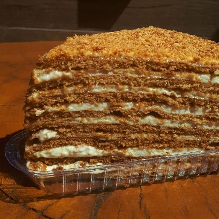 Deixe-se envolver pela magia do Medovik, o bolo mais querido da Rússia! Elaborado artesanalmente, este bolo é composto por diversas camadas ultrafinas de biscoito de mel, levemente tostadas e irresistivelmente macias.